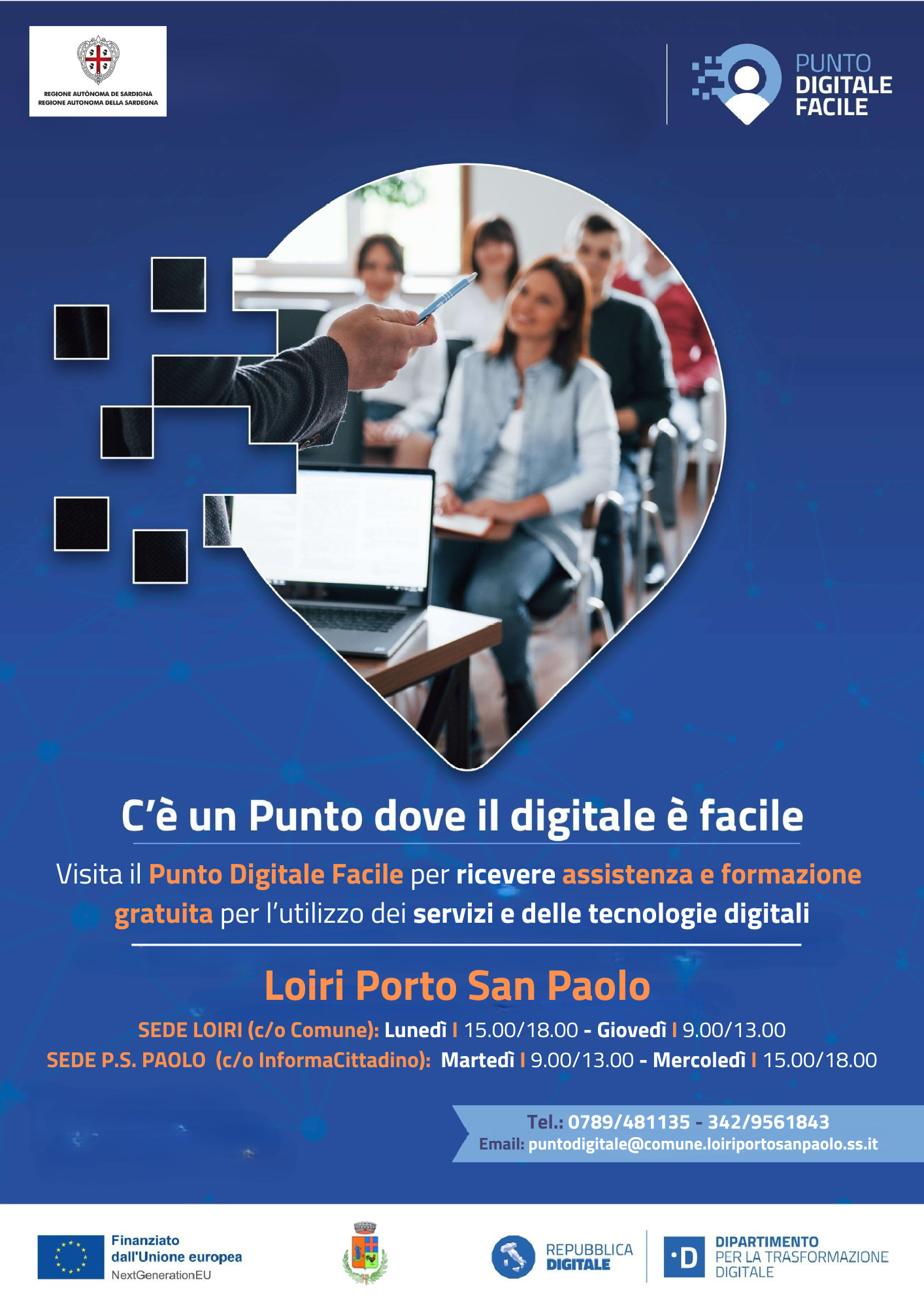 È possibile recarsi presso i Punti Digitali negli orari indicati oppure contattare il servizio via email all’indirizzo puntodigitale@comune.loiriportosanpaolo.ss.it o telefonicamente ai numeri 0789 481135 – 342 9561843.