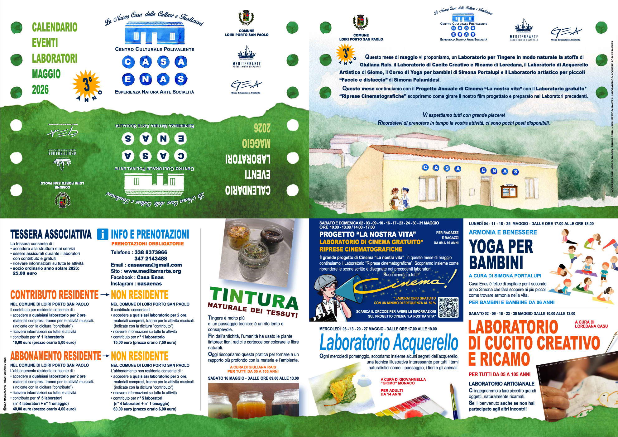 Questo mese di maggio vi proponiamo, un laboratorio per tingere in modo naturale la stoffa di Giuliana Rais, il laboratorio di cucito creativo e ricamo di Loredana, il laboratorio di acquerello artistico di Giomo, il corso di yoga per bambini di Simona Portaluppi e il laboratorio artistico per piccoli "Faccio e disfaccio" di Simona Palamidesi.
